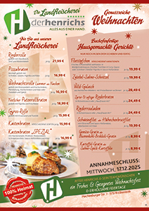 1. Vorbestellen 📩 bis zum 17.12.2025 per Email (getraenkemarkt@der-henrichs.de), FAX 02747-4164847, telefonisch 📞 02747-2203 oder persönlich in unserer Landfleischerei (Hachenburgerstr. 1, 57578 Elkenroth)